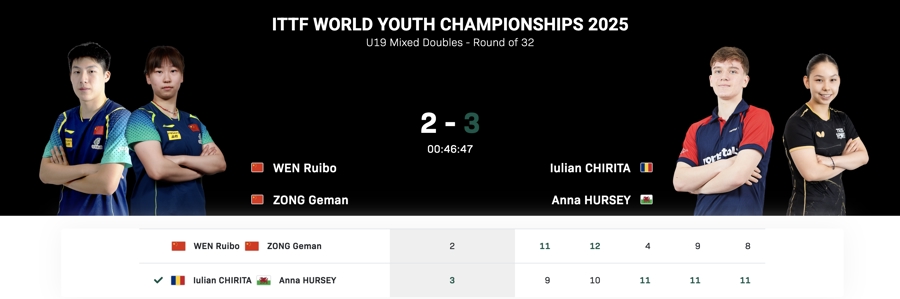 正在罗马尼亚克卢日-纳波卡举行的2025年国际乒联世界青少年乒乓球锦标赛再度爆出冷门。在11月25日的U19混双十六分之一决赛中,中国组合温瑞博/纵歌曼在先赢两局的优势局面下痛失好局,最终以11比9、12比10、4比11、9比11、8比11的比分,遭罗马尼亚与威尔士的跨国组合尤利安·基里塔/安娜·赫尔希逆转,无缘十六强。